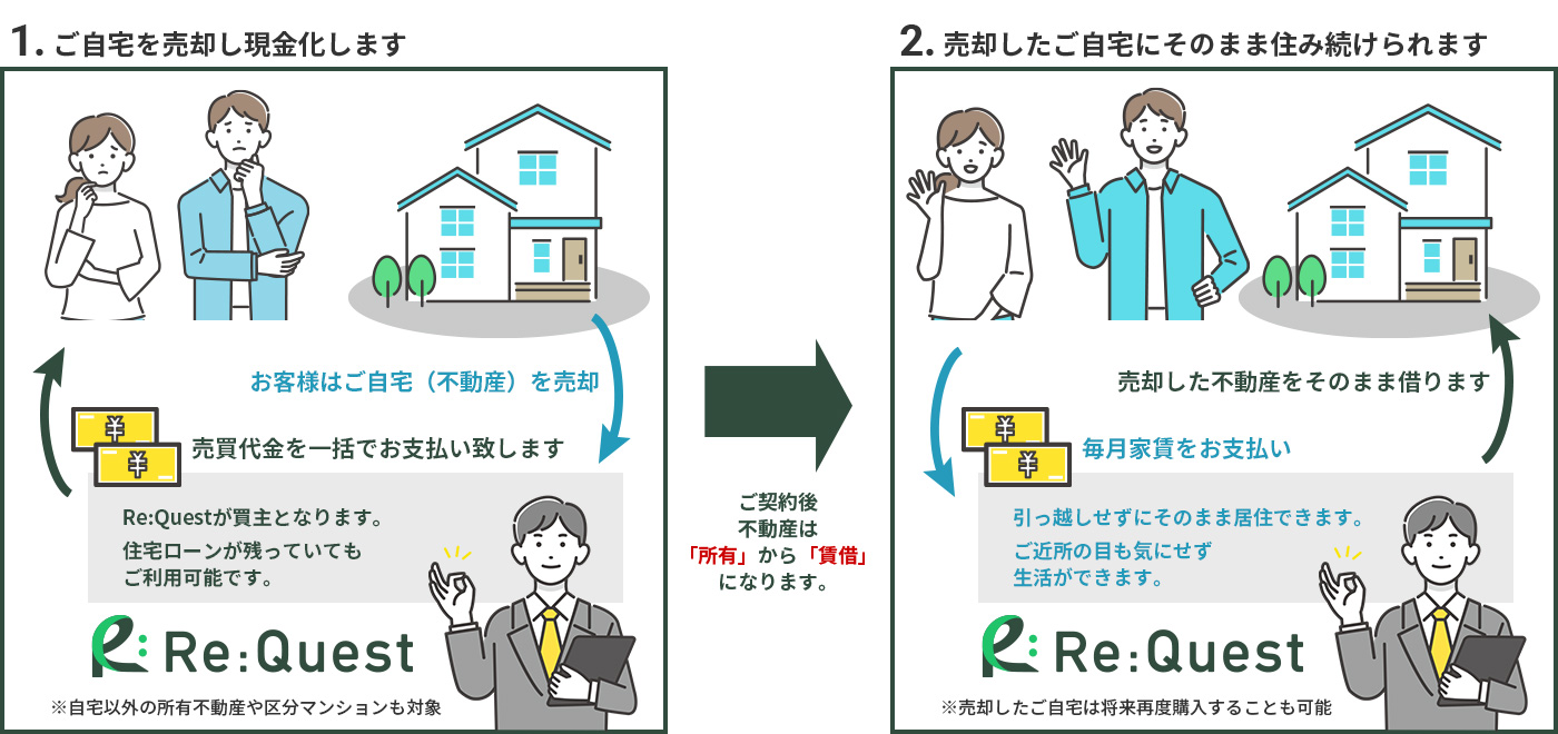 ReQuestのリースバックでは、お客様の大切なご自宅を弊社が買主となり直接お客様のご自宅(不動産)をご購入し、お客様は賃貸としてそのまま住み続けていただくことができます。